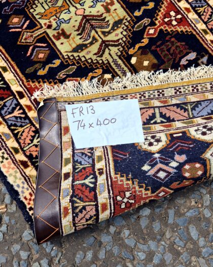 4m long wool oriental runner with blue ground colour. An attractive way to add some colour to your hall or entrance.