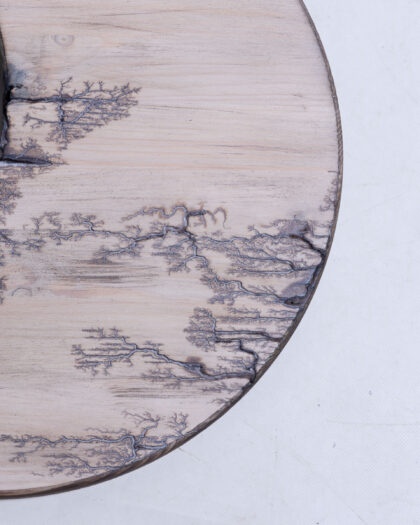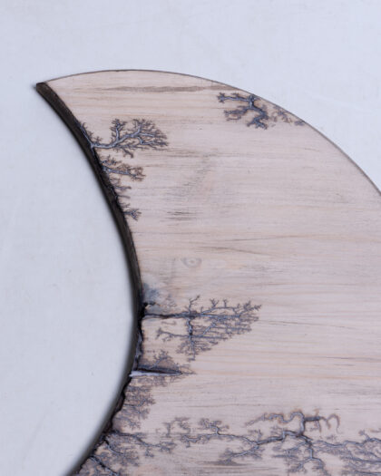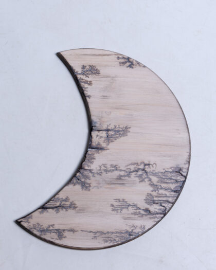 Wooden crescent moon with Lichtenberg figure burn design. Unique fractal patterns created using high-voltage electricity. Perfect for home décor.