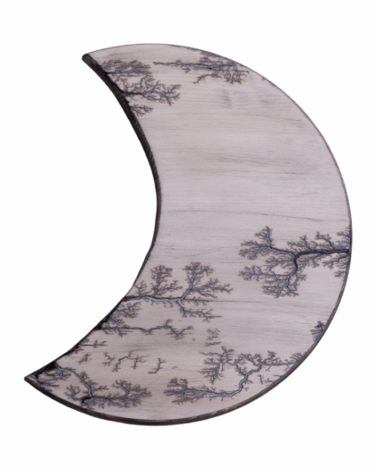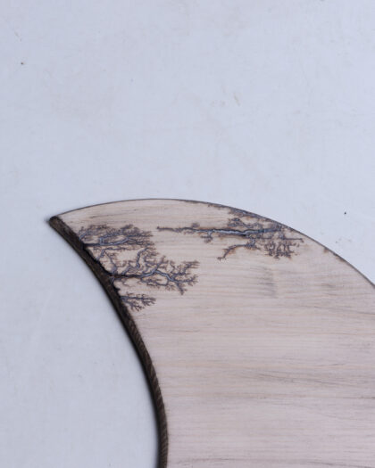 This striking decorative wooden board features a unique fractal Lichtenberg design. The natural wood grain provides a light, neutral base, accented by the intricate dark patterns created by high-voltage electricity burning across the surface. The fractal patterns resemble branching trees or lightning strikes, giving it a fascinating, organic yet modern aesthetic. The board has a smooth finish and a shaped edge, adding to its visual appeal. This would make an interesting addition to any home as decor.