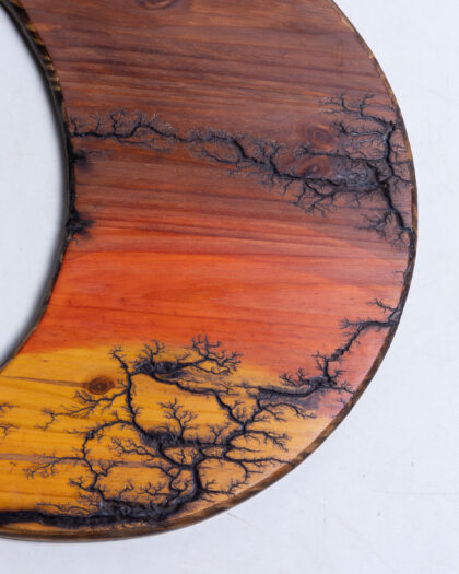 This striking decorative piece showcases the natural beauty of wood combined with fractal Lichtenberg burning. The piece is shaped like a crescent moon and exhibits stunning wood grain patterns in shades of brown, orange and yellow. The fractal burning creates intricate, lightning-like patterns across the wood surface, adding a touch of organic drama. This artwork is a unique decorative item suitable for any room or style.
