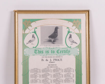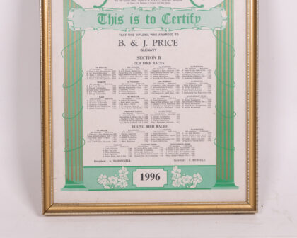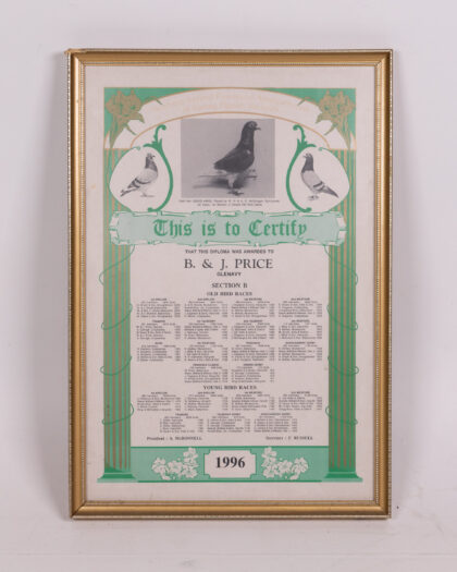 Framed and glazed certificate from the Northern Ireland Provincial Amalgamation of Racing Pigeon Societies, awarded to B. & J. Price, Glenavy, in 1996. The certificate features images of pigeons and decorative art nouveau style borders. The certificate lists winners of old bird and young bird races, and the names of the President and Secretary. The frame is wooden with a gold finish. It shows some age. This vintage racing pigeon certificate is a unique piece of Irish history.