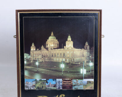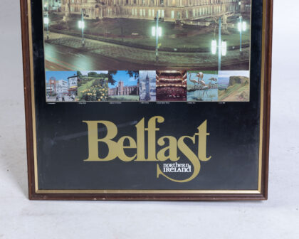 This is a framed print of Belfast, Northern Ireland. The image is of the city hall lit up at night. There are also smaller photos showing the city. The print has a black background with gold lettering. The frame is wooden with a gold trim. Overall the item is in good condition and would be a lovely piece of wall art.