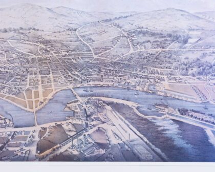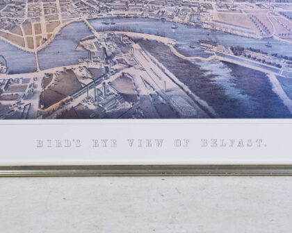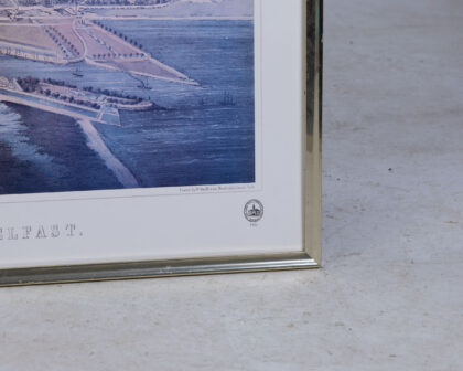 This is a framed print depicting a bird's eye view of Belfast, presented in a gold coloured frame. The print itself features a detailed illustration of the city, with various landmarks and geographical features visible. The colour palette is dominated by blues, greys, and muted tones, giving it a vintage feel. The frame is simple yet elegant, complementing the artwork nicely. It features a white border, which sets off the print well. The overall condition is good. There is a label in the corner, which dates it as 1982.