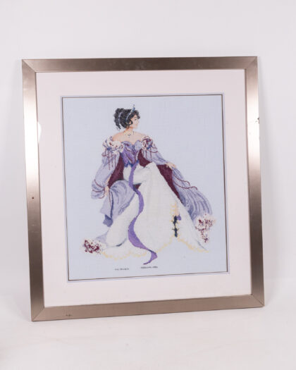 Framed cross stitch needlework picture dated February 2006, depicting a lady in a long dress, in purple and white colours, set in silver frame.
