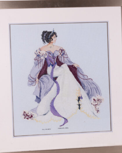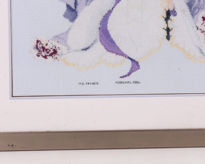 This is a framed cross stitch needlework picture created by M.E. Francis and dated February 2006. The needlework depicts a lady in a long dress. The colours are predominantly purple and white. The frame is silver coloured. There are some minor marks on the frame due to age. This picture is ready to hang.