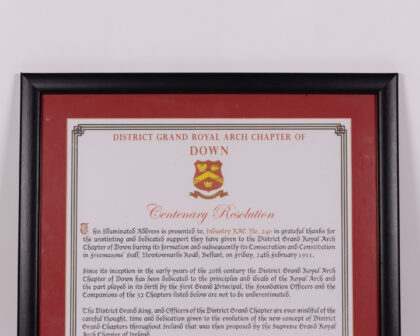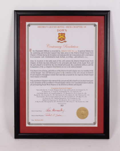 Framed Masonic print from the District Grand Royal Arch Chapter of Down, celebrating their centenary in 2011. Framed in a black wooden frame.