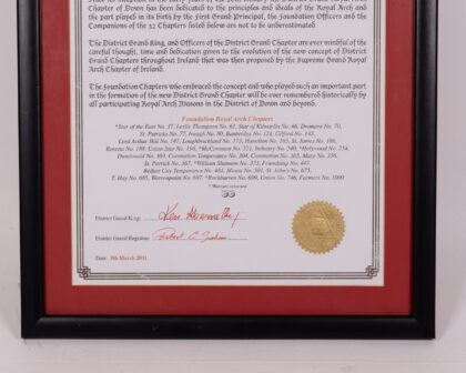 This is a framed commemorative print from the District Grand Royal Arch Chapter of Down, celebrating their centenary in 2011. It is framed in a black wooden frame with a red mount. It features a gold crest at the top and a gold seal at the bottom, as well as the signatures of District Grand King Ken Abernethy and District Grand Registrar Robert C. Graham. The print is in good condition.