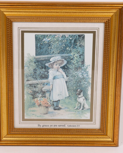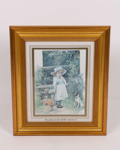Charming framed print featuring a young girl in a white dress and hat, standing in a garden setting with a dog. The picture is framed in a decorative gold frame with a white and gold border. A bible quote 'By grace ye are saved. Ephesians 2:5' is printed below the image. The print is in good condition, perfect for adding a touch of vintage charm to any room.