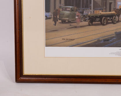 This is a framed print depicting a street scene in Belfast, titled 'Great Victoria Street, Belfast' by Eric Bottomley. The print showcases a vintage tram, cars, and architecture, capturing a nostalgic view of the city in the mid 20th century. The print is in good condition and set in a wooden frame with a gold inner trim which has some age related wear. This artwork offers a glimpse into the past and would be a great addition to any home or office.