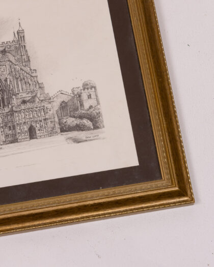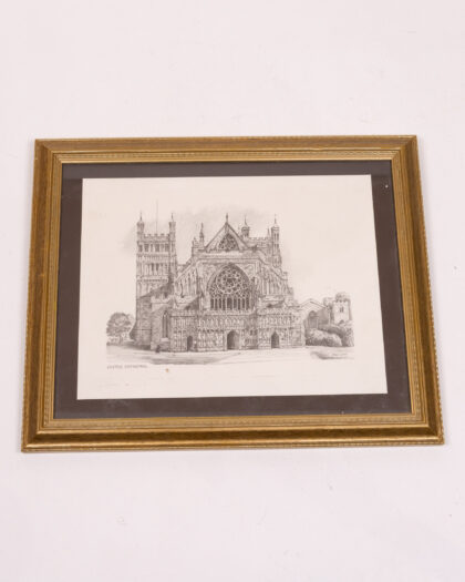 Framed print of Exeter Cathedral in gold coloured wooden frame. Architectural drawing adds sophisticated historical style. Good condition.