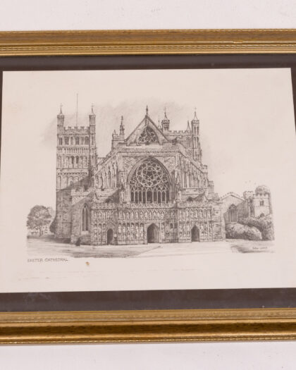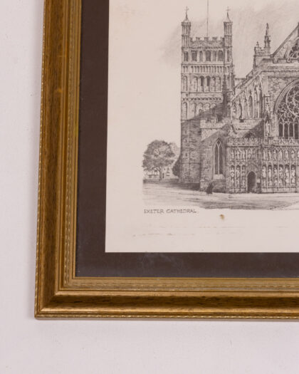 This is a framed print depicting Exeter Cathedral in a detailed architectural drawing style. The artwork features intricate linework capturing the cathedral's facade, towers, and surrounding details. The print is set within a black mount, which is framed by a gold-coloured wooden frame adding a touch of elegance. The back of the frame shows the fixings for wall mounting. There is some minor wear and tear to the frame consistent with age, but the print itself appears to be in good condition. This item would be a great decorative wall art piece.