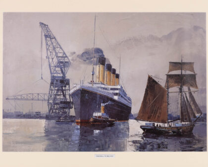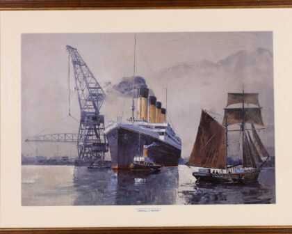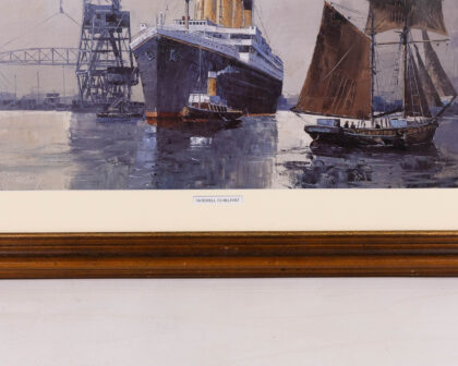 Framed print of a painting titled 'Farewell to Belfast', featuring the Titanic at port, with a crane and sailing ship in the background. The print is encased in a simple brown wooden frame, complemented by a neutral inner mount. The artwork depicts a maritime scene with a focus on the famous ship. It would make a great gift for someone interested in maritime history.