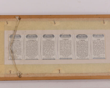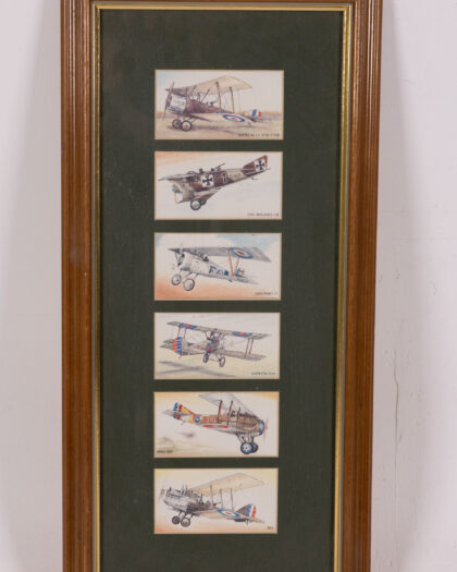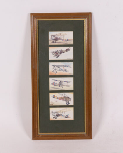 Framed collection of 'Aircraft First World War' cigarette cards. Six cards featuring different WWI aircraft, mounted in a brown wooden frame.
