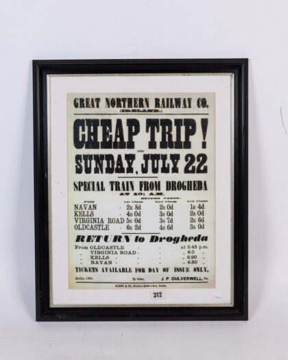 Framed vintage print, 'Great Northern Railway Co. (Ireland) Cheap Trip!' Some foxing, and water damage. A unique piece of railway history.