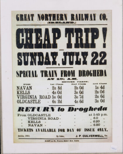 This is a framed vintage print advertising a "Cheap Trip!" on the Great Northern Railway Co. (Ireland). The poster advertises a special train from Drogheda on Sunday, July 22nd at 10: A.M., with fares listed for 1st, 2nd, and 3rd class from Navan, Kells, Virginia Road, and Oldcastle. The print is framed in black and has a small amount of foxing.