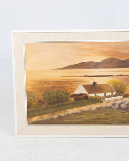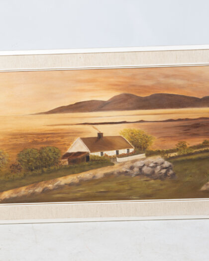 This vintage framed oil painting by M. K. Stewart a reputable Irish Artist captures an Irish serene countryside landscape, , featuring a charming cottage nestled among rolling hills. The painting is rendered in warm, earthy tones, with the cottage and surrounding greenery vividly depicted. The sky shows a soft orange hue, possibly at sunrise or sunset. The painting is signed by the artist (H.G.ST. WALT) and is housed in a simple frame with fabric detail. The painting is in good condition. Ready to hang. This piece would add a touch of rustic charm to any living room or home office.
