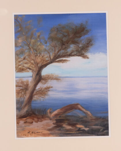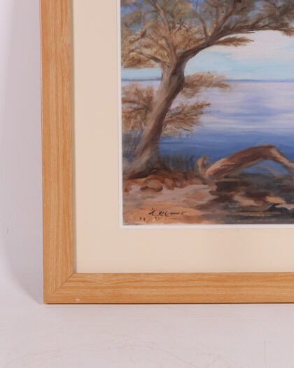 This is a framed landscape painting featuring a tree next to a shoreline with a calm blue sea. The painting is signed by the artist. The frame is made from wood. The colours are primarily blue, brown and cream. The painting is in good condition. Would be suitable for any room of the home.