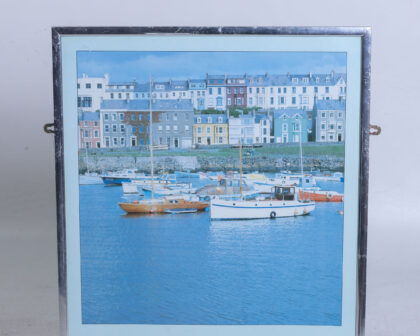 This is a framed original poster of a harbour scene in Northern Ireland. The print depicts colourful buildings along the waterfront, boats in the harbor, and a pale blue sky. The frame is silver-toned metal and has small pivoting brackets on either side, as shown in the picture. The print is in good condition. A charming item for a home or office.