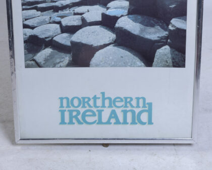 This is a framed original poster featuring the Giant's Causeway in Northern Ireland. The print showcases the unique basalt columns and the rugged coastline. The frame is silver-toned. There are some light surface marks on the frame consistent with age, but these do not detract from the overall appearance or impact the image itself. This print would make a lovely addition to any room, adding a touch of natural beauty and a reminder of the scenic wonders of Northern Ireland.