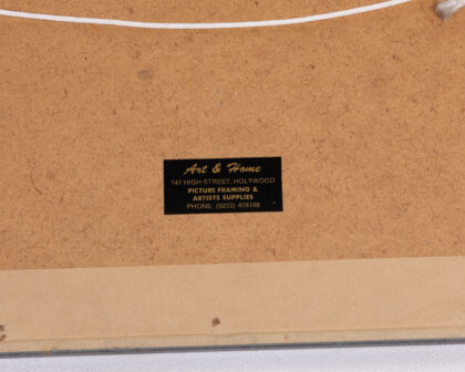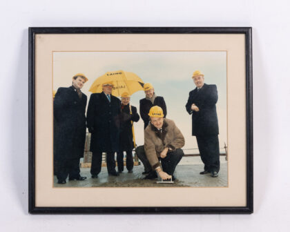 Framed photographic print of a group of men wearing yellow 'LAING' hard hats. One of the men is kneeling and appears to be trowelling a slab. One of the men is holding a yellow umbrella. The photograph is mounted and framed in a black wooden frame. The frame has some marks and minor damage but is in otherwise good condition. The back of the frame is covered in brown paper and has a label from 'Art & Home' in Holywood. The print is in good condition.