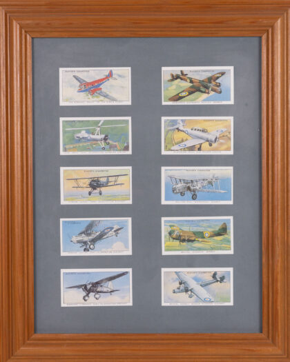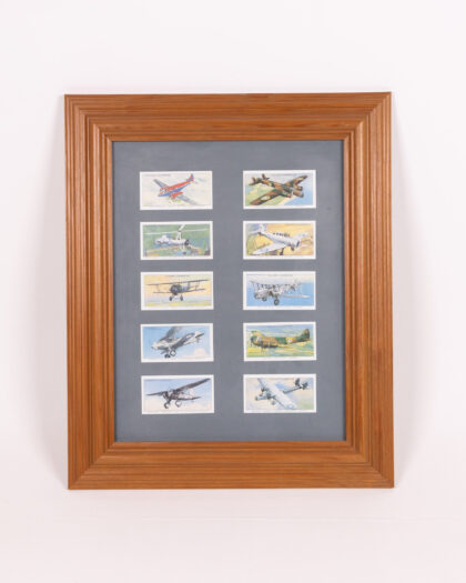Framed collection of ten Player's Cigarettes cards. Each card features different aeroplanes with the aircraft name and details on the front. The frame is wooden. The print is glazed with a grey card mount. The cards are in good condition considering their age. The frame has some very minor signs of wear.