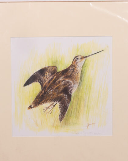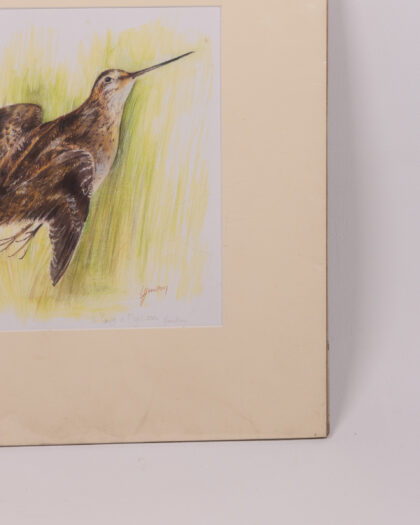 This is a lovely framed bird print by the artist Hamilton, titled 'Snipe in Flight', showing a game bird in flight. The print is signed by the artist and dated 2006. It features a mix of brown, black, and cream colours. It is framed in a cream coloured wooden frame. The print is in good condition. This would be ideal in a living room, study, or hallway and would be especially suited to a country style home.