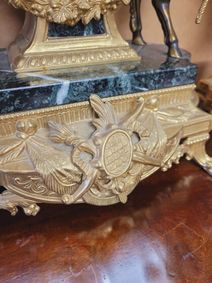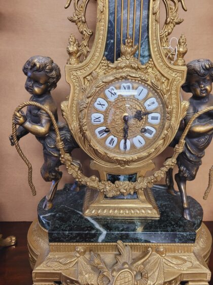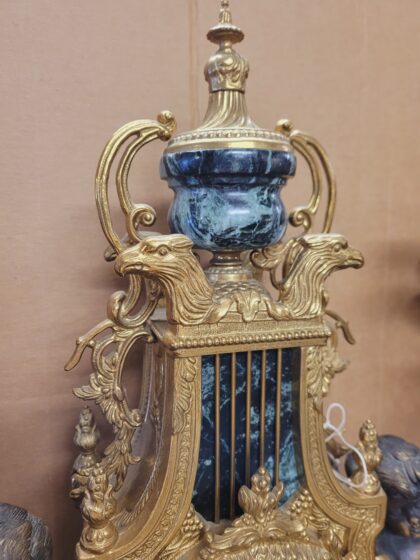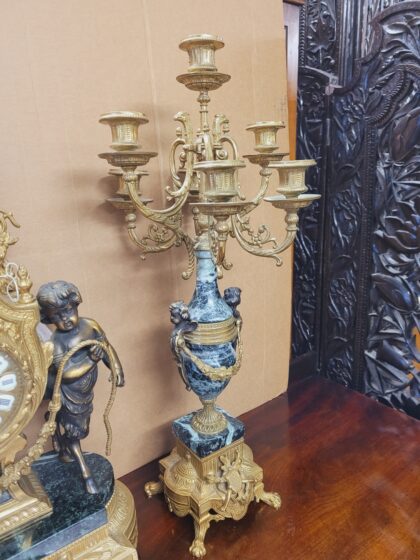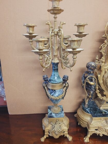 Lancini Mantel Clock and matching pair of Candelabras. This impressive set with decorative accents including eagles, satyrs, and cherubs. made from brass, marble & gold gilt together