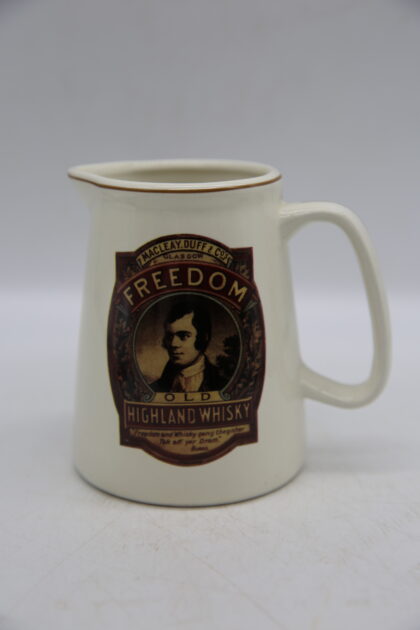 A white glazed ceramic bartop water jug. Bears lettering which, "MacLeay Duff & Co's Glasgow Freedom Old Highland Whisky "Freedom and Whisky gang thegither Tak aff yer Dram." Burns.". Made by Trent Memorabilia England and bears black backstamp to base.