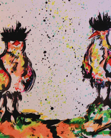 This is a brand new art print by the artist Kate Broderick. The print features a contemporary and colourful design of two crested birds. The birds are painted in vibrant shades of orange, green, and black, with splatters of colour creating a dynamic and lively composition. The print measures 42 x 30cm. It is a striking piece of art that would brighten up any room.