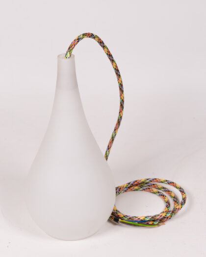 This frosted glass light fixture will add a subtle yet bold style to your home. The teardrop-shaped glass shade features a vibrant, multi-coloured fabric cord. This striking ceiling light will be the perfect addition to your home.