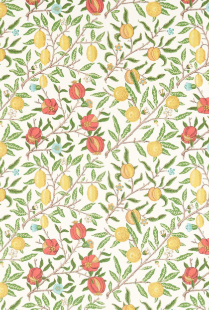 First produced as a wallpaper in 1864, Fruit is one of Morris’s earliest designs. Displaying an abundance of ripened pomegranates hanging from the branches of an overflowing tree, flora and fauna entwine to give this fabric greater depth. Available in a cotton linen blend, Fruit is suitable for both drapes and upholstery.