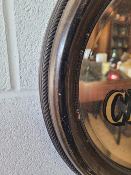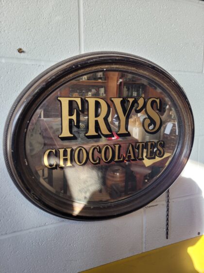 An antique mirror with bevelled edge and frame that has been hand-painted to read, "Fry's Chocolates" in gold and black lettering.