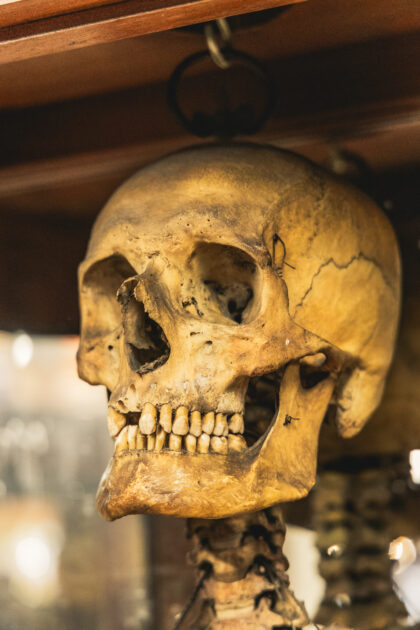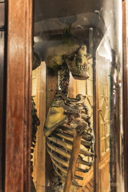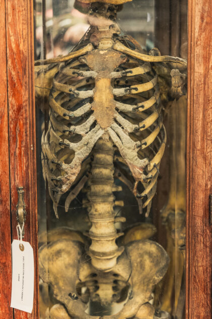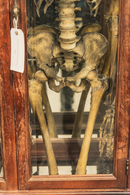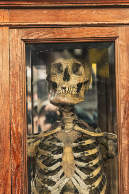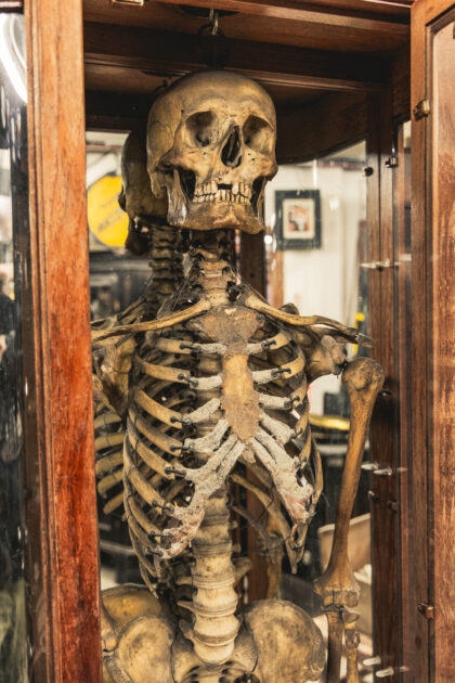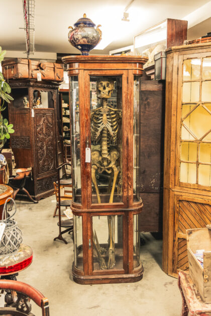 A complete human skeleton in a large glass display case. Truly a talking piece!