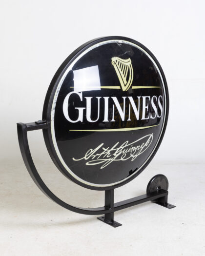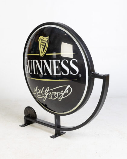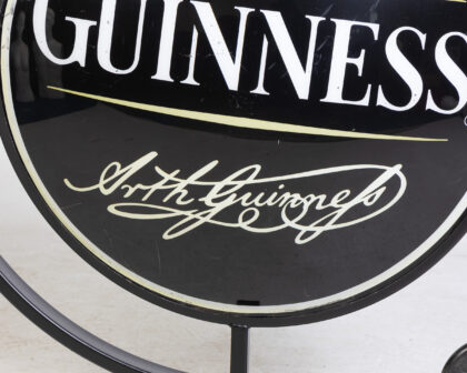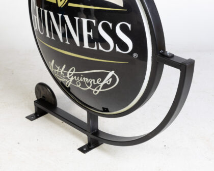 Vintage Guinness pub sign featuring the iconic harp logo and Arthur Guinness's signature. The sign is black with gold and white detailing. Mounted on a black metal wall mount. A classic piece of pub memorabilia for a Guinness enthusiast or collector.