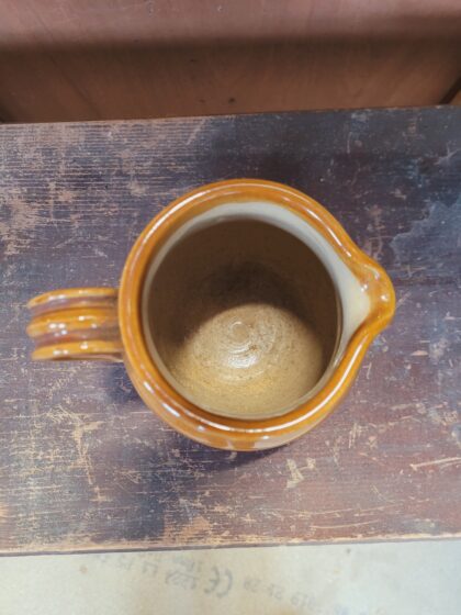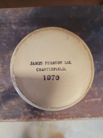 A brown two tone glazed stoneware jug. Bears impressed marks which read, "G.P.O". Bears black lettering to base which reads, "James Pearson Ltd. Chesterfield. 1970".