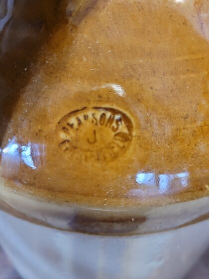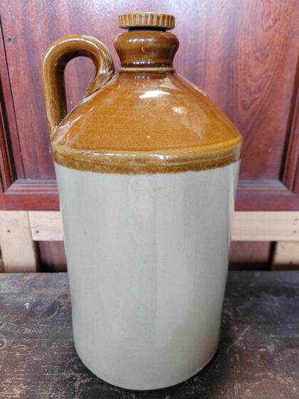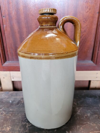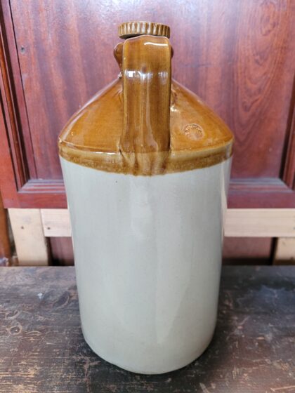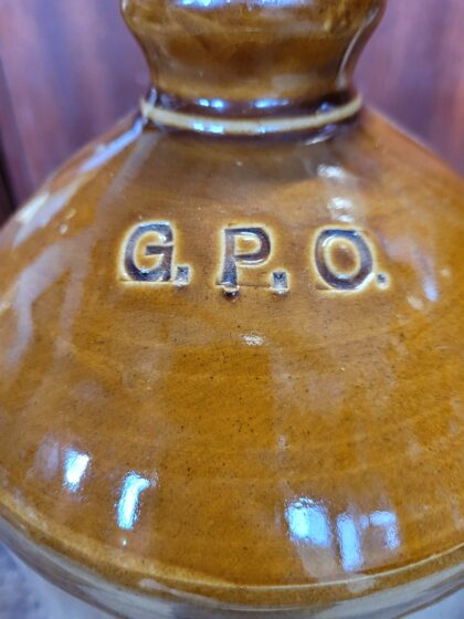 A brown two tone glazed stoneware flagon with screw fitting lid. Bears impressed marks "G.P.O.". Made by Pearsons Chesterfield and bears impressed makers mark.