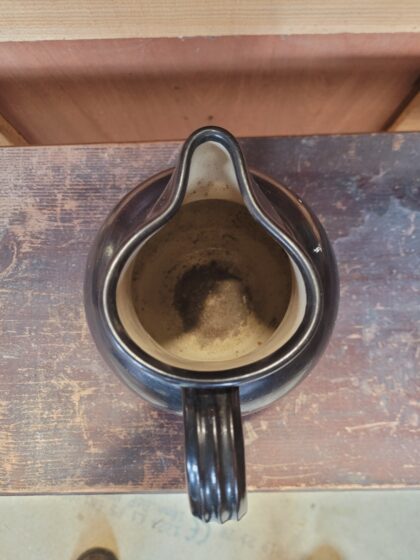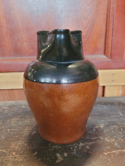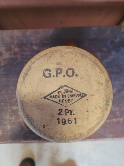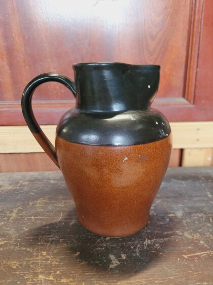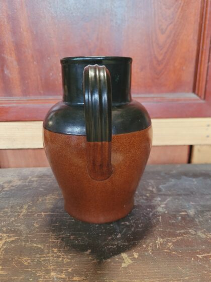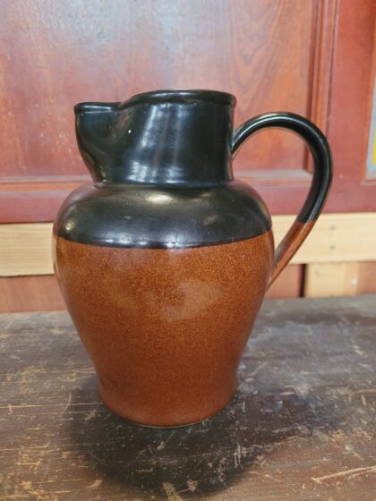 A brown and black glazed stoneware jug. Bears black lettering to base which reads, "G.P.O. Bourne Denby Made in England 2Pt. 1961".