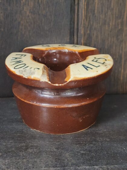 A brown glazed stoneware ashtray. Bears black lettering which reads, "G. & W. Famous Ales". Made by Price Bristol and bears backstamp to base.
