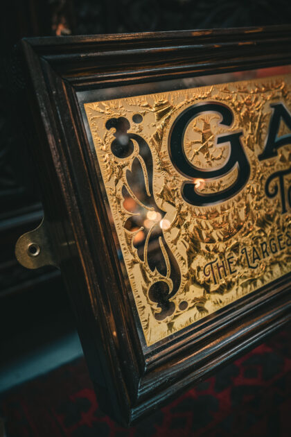 Gallahers Tobacco Factory Hand Crafted Mirror. Reverse painted, glue chipped and gilded with 22ct gold leaf writing. Handmade Frame.