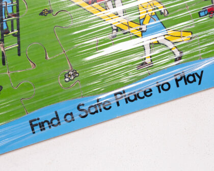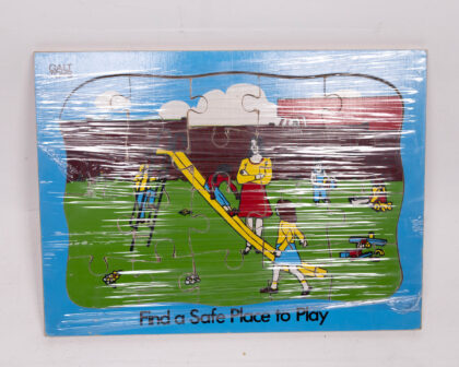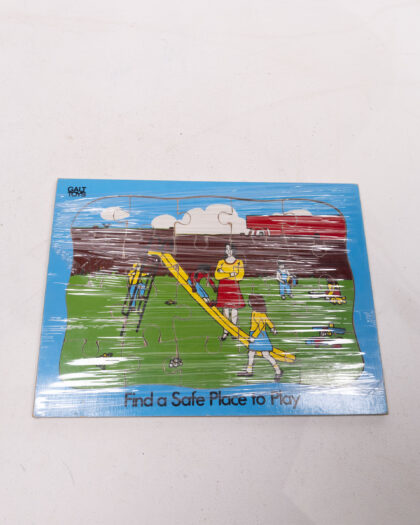 Vintage Galt Toys jigsaw puzzle, featuring a colourful playground scene with children playing on various equipment. The puzzle is sealed in plastic wrap to keep it complete. The image shows a seesaw, slide, and other playground staples. The phrase 'Find a Safe Place to Play' is printed along the bottom.