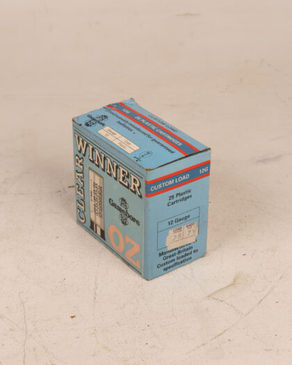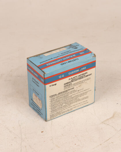 A vintage box of Gamebore Clear Winner 12G cartridges. The box is marked 'Custom Load'. This item is a collectible piece, it is in good condition, making it a great addition to any collection or display. The box shows some wear commensurate with age. Features the Gamebore logo and branding.