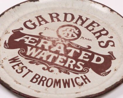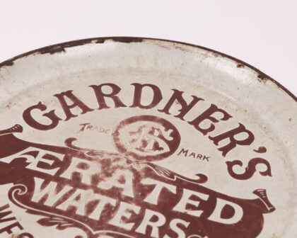 'Gardner's Aerated Waters' Drinks Tray. Cream & Brown enamel on metal, with 'West Bromwich' text. Decorative collectible. Worn condition.