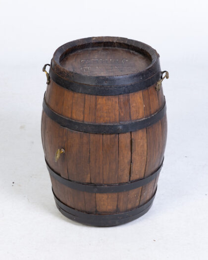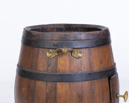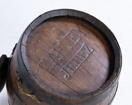 This vintage Garvey Jerez barrel has been ingeniously repurposed into a charming drinks cabinet. The barrel features its original markings, including the 'GARVEY JEREZ' branding. It has a hinged door that opens to reveal storage space, perfect for bottles or barware. The exterior retains its rustic appeal with metal bands and aged wood. A brass spigot detail adds character. Ideal for a home bar or a unique decorative accent. Please examine photos carefully for condition.
