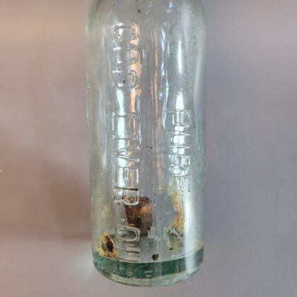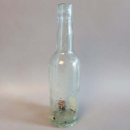A clear glass bottle with lettering that reads, "Sawers Ltd. Pure Cod Liver Oil". A cork is stuck inside.