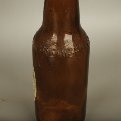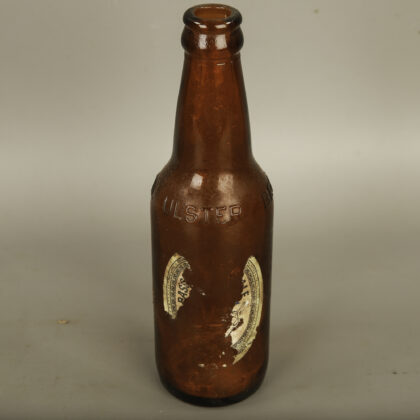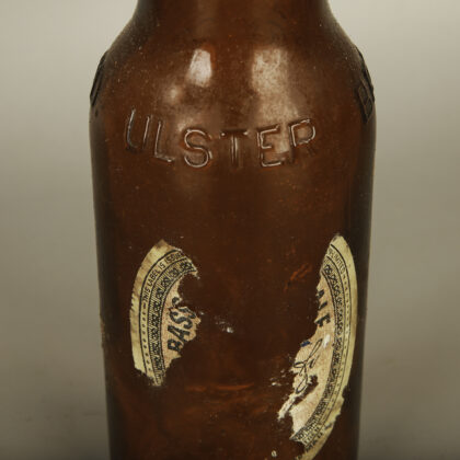 A brown glass bottle with extruded lettering that reads, "Ulster Brewery Co. Ltd.". It features the remains of a Bass Pale Ale sticker.