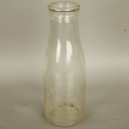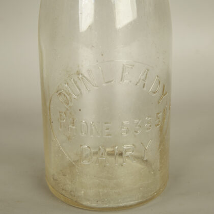 A clear glass milk bottle bearing extruded lettering which reads, "Dunleady Dairy Phone 53851".