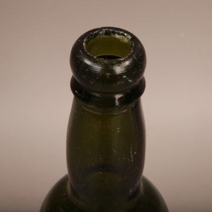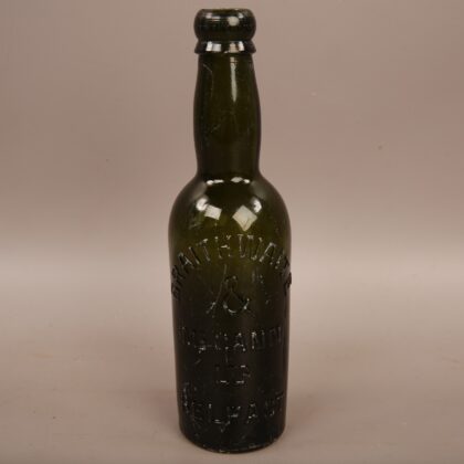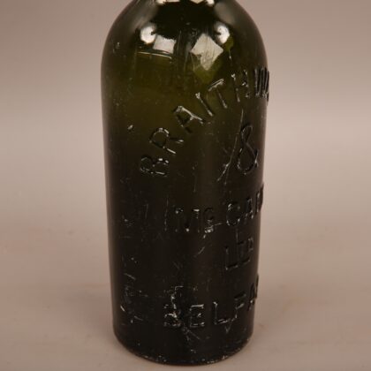 An antique green glass bottle with extruded lettering that reads, "Braithewaite & McCann Ltd. Belfast".