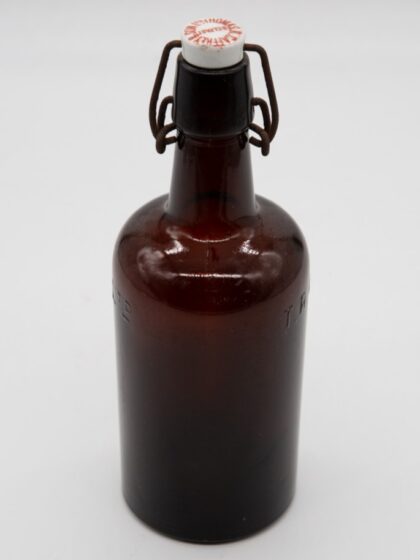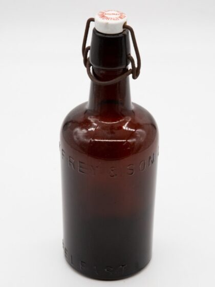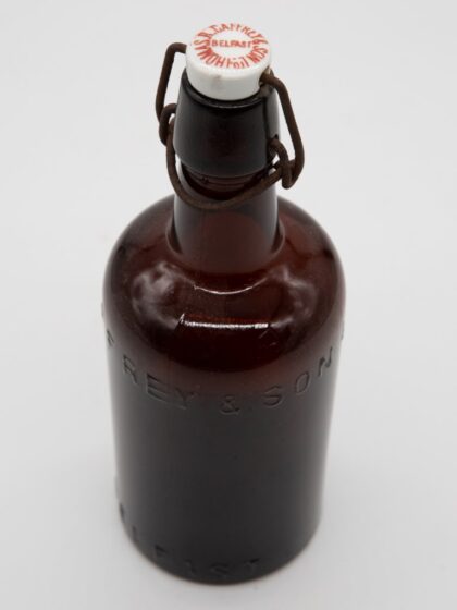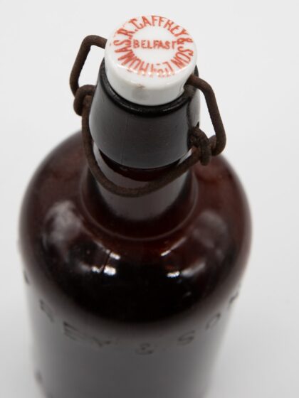 A brown glass bottle bearing extruded lettering which reads, "T. R. Caffrey & Son Ltd. Belfast". Features matching porcelain stopper.