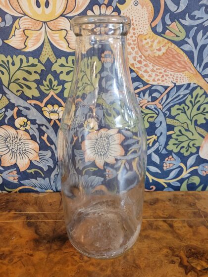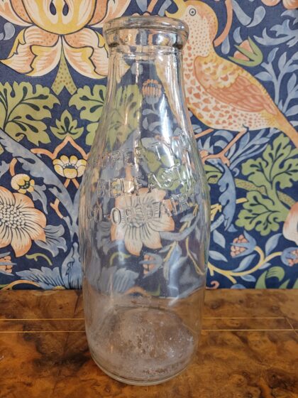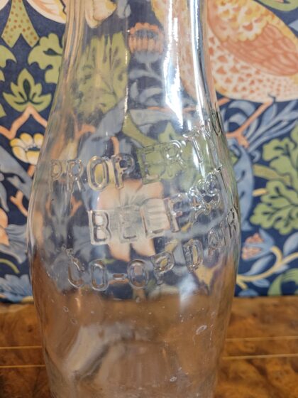 A large glass milk bottle with extruded lettering which reads, "Property of Belfast Co-op Dairy".