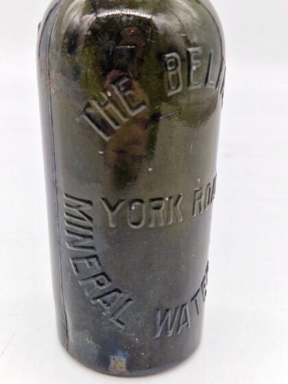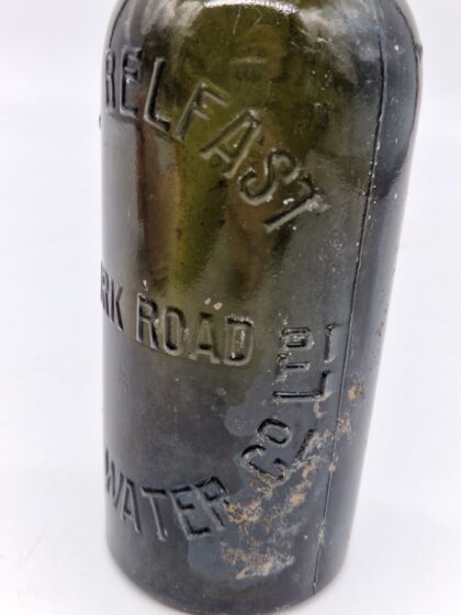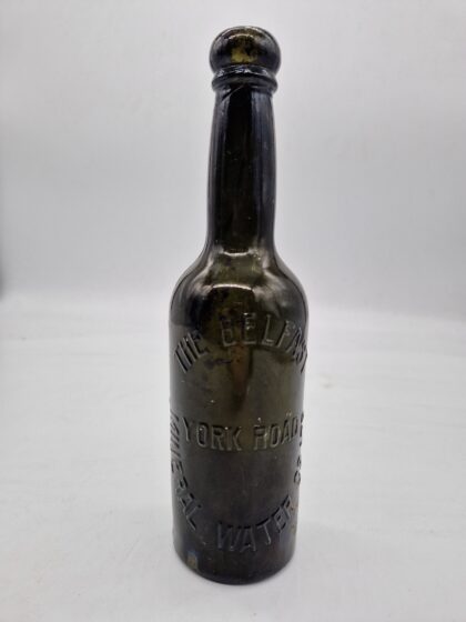 A dark green glass bottle for The Belfast Mineral Water Co. Ltd. York Road.